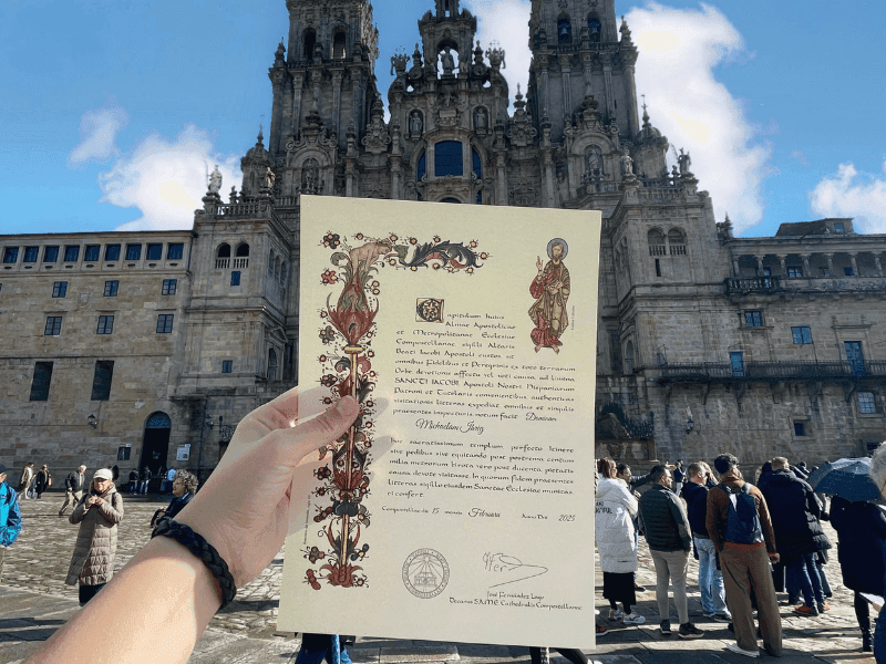 Keď dorazíte do Santiaga de Compostela, vaša identifikačná karta bude skontrolovaná na Kancelárii pútnikov. Obdržíte svoj certifikát Compostela, ak ste prešli aspoň 100 km alebo bicyklovali 200 km. Tento certifikát je uznaním vašej snahy a cesty, ktorú ste absolvovali.